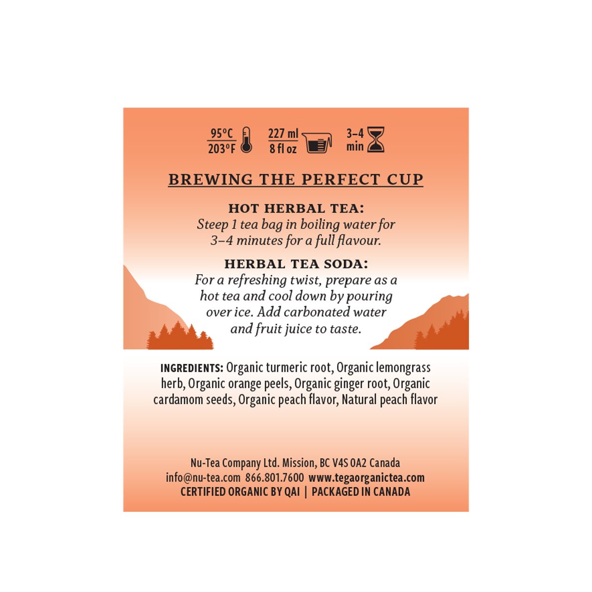 Luxury organic ingredients: Turmeric root, Lemongrass, Sweet orange peels, Ginger root, Cardamom seeds, Organic & Natural Peach flavor